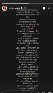 स्पष्ट करने के लिए नेहा ने कहा कि उनका पोस्ट भावनाओं में किया गया था और इसे गलत संदर्भ में लिया जा रहा है। उन्होंने लिखा कि “मुझे पता है कि मैं सोशल मीडिया पर बहुत भावुक हो जाती हूं, और मीडिया चीज़ों को बढ़ा चढ़ाकर दिखा देता है।” उन्होंने यह भी कहा कि उन्हें लगता है कि उन्हें इससे सबक मिलेगा कि वे आगे से अपने निजी जीवन का खुलासा नहीं करेंगी।