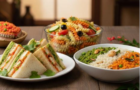 सैंडविच को ब्रेड के स्लाइस में लेयर करके त्रिकोण या आयताकार काटें और चाट मसाला या नींबू के रस से सजाएं। यह व्यंजन बच्चों के लंच बॉक्स के लिए भी परफेक्ट है और मेज पर रंगों की खूबसूरती बढ़ाता है।