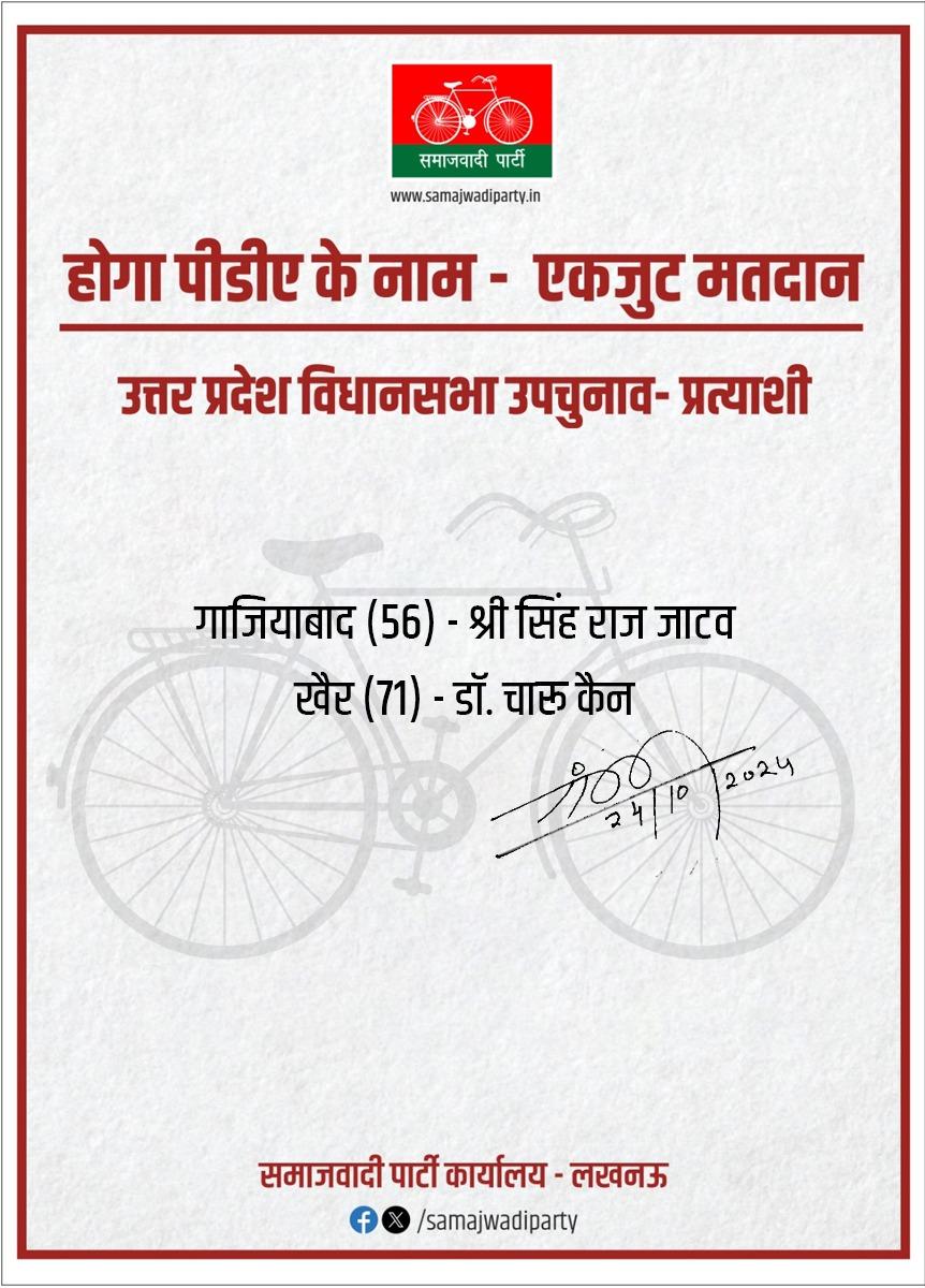 Ghaziabad: समाजवादी पार्टी (सपा) ने उत्तर प्रदेश के विधानसभा उपचुनावों के लिए अपने प्रत्याशियों की घोषणा कर दी है। गाजियाबाद से सिंह राज जाटव और खैर से डॉ. चारू कैन को उम्मीदवार बनाया गया है। इस घोषणा के साथ ही सपा ने आगामी चुनावों में अपनी रणनीति को स्पष्ट कर दिया है। वहीं, कांग्रेस ने उपचुनाव न लड़ने का फैसला किया है, जिससे इंडिया गठबंधन में भी सीट बंटवारे की स्थिति साफ हो गई है।