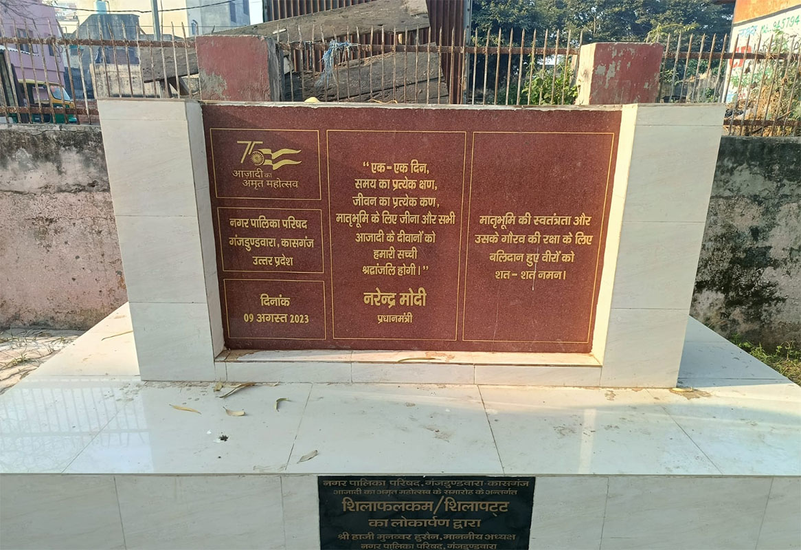 District Kasganj: जनपद कासगंज के कस्बा गंजडुण्डवारा में नगर पालिका के जिम्मेदार एवं जनप्रतिनिधि महापुरुषों एवं शहीदों के सम्मान में उदासीन हैं।नगर पालिका कार्यालय के सामने स्थित गांधी पार्क में शहीदों के सम्मान में पालिका प्रशासन द्वारा बनाए शिलाफलकम एवं चौक चौराहे पर महापुरुषों की स्थापित प्रतिमाओं (statues of great men) की दुर्दशा देख गौरवान्वित होने की बजाय लोगों शर्मिंदगी महसूस जब शहीदों के सम्मान में केंद्र सरकार – द्वारा मेरा माटी मेरा देश अभियान क चला और शिलाफलकम के मक्ष सम्मान के लिए शपथ प ग्रहण कार्यक्रम भी हुआ ।लेकिन आज यह भी धूल व आवारा पशुओ के मल मूत्र से पटी हुई है।