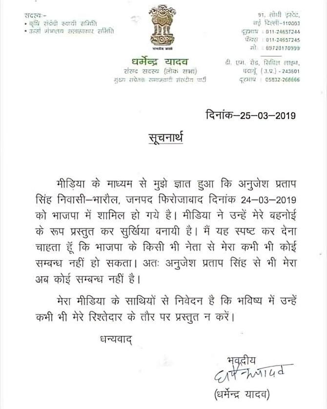 धर्मेंद्र यादव ने एक चिट्ठी जारी कर अपने रिश्ते की समाप्ति की जानकारी दी। इस चिट्ठी में उन्होंने साफ किया कि राजनीतिक करियर को प्राथमिकता देना उनकी मजबूरी थी। चिट्ठी में उन्होंने यह भी कहा कि राजनीति और पारिवारिक रिश्तों के बीच संतुलन बनाना मुश्किल हो रहा था, जिसके चलते उन्हें यह कड़ा निर्णय लेना पड़ा। धर्मेंद्र ने यह भी स्पष्ट किया कि उनके लिए पार्टी और राजनीतिक भविष्य पहले हैं, और उन्हें अपने पारिवारिक संबंधों को इस समय पीछे छोड़ना पड़ा।